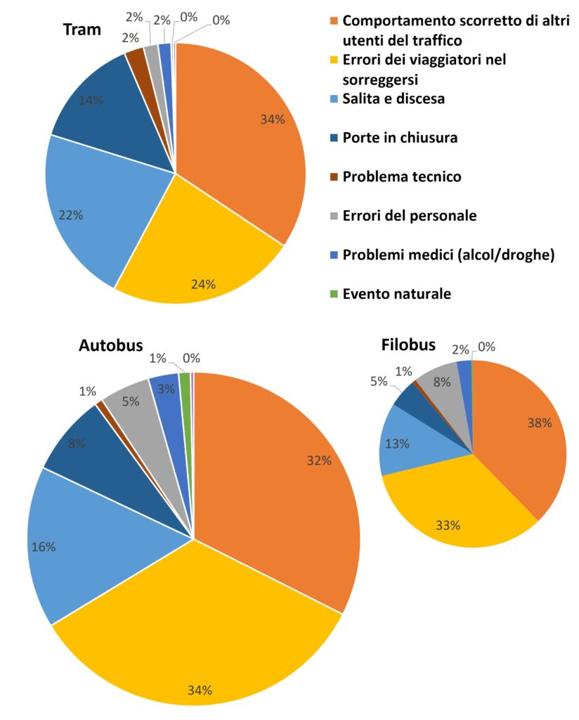 Il grafico mostra che oltre tre quarti degli incidenti dei passeggeri nei trasporti pubblici sono attribuibili a tre cause principali: